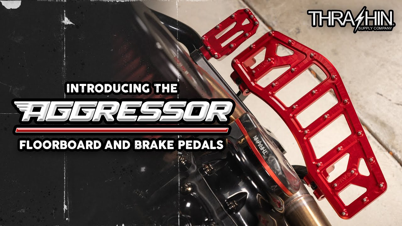 The THRASHIN® Aggressor Floorboards are designed to provide the maximum amount of grip and improve ground clearance while maintaining a sleek and timeless design. Featuring 24 cone-shaped stainless steel cleats per floorboard, and placed on our larger foot-shaped platform, these boards not only look great but will improve the feel of your motorcycle.